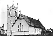 The original church circa 1889, featuring the newly built bell tower