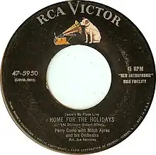 The first recording of "Home for the Holidays", arranged by Joe Reisman, was made on November 16, 1954. It was released as a single for Christmas that December by RCA Victor.[2] The flip side was "Silk Stockings" (which scored in the Cash Box magazine top 50). In the United States, "Home for the Holidays" peaked at number eight on Billboard magazine's Most Played by Jockeys chart (in the issue dated January 8, 1955) and at number 18 on Billboard's Best Sellers in Stores chart (in the issue dated January 1, 1955).[3] The next Christmas the song was released again, with "God Rest Ye Merry, Gentlemen" as the flip side.[4] The same recorded version was released in the United Kingdom by HMV,[5] with the flip side "Tina Marie". This recording has appeared on many compilation albums over the years and remains a Christmas radio regular.
