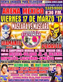 Homenaje a Dos Leyendas (2017) (Spanish for "Homage to Two Legends") was a professional wrestling pay-per-view event, scripted and produced by Consejo Mundial de Lucha Libre (CMLL; "World Wrestling Council"). The Dos Leyendas show took place on March 17, 2017 in CMLL's main venue, Arena México, Mexico City, Mexico. The event was to honor and remember CMLL founder Salvador Lutteroth, who died in March 1987. Starting in 1999 CMLL honored not just their founder during the show, but also a second lucha libre legend, making it their version of a Hall of Fame event. For the 2017 show CMLL commemorated the life and career of Arturo Díaz Mendoza, better known under the ring name Villano III.[2] This was the 19th March show held under the Homenaje a Dos Leyendas name, having previously been known as Homenaje a Salvador Lutteroth from 1996 to 1998.