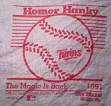 The Official Star Tribune Homer Hanky is a handkerchief-like rally towel printed for the Minnesota Twins. It was first introduced during the 1987 pennant race by the Minneapolis Star Tribune as a promotional item when the Twins won the American League Western division (AL West).[1] Homer Hankies have been reprinted with different designs over the years to commemorate various occasions, including division titles, the inaugural opening day at Target Field, and the 2014 All Star Game. The Homer Hanky has been manufactured by several companies over the years, including Bensussen, Deutsch & Associates LLC and Winona, Minnesota based company, WinCraft Inc.[2][3]