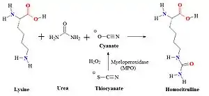 Myeloperoxidase released from neutrophils converts thiocyanate to cyanate which carbamylates lysine residues to form homocitrulline. Thiocyanate (SCN−) is a naturally occurring pseudohalide found in dietary sources. Myeloperoxidase can use SCN− as a cosubstrate together with hydrogen peroxide (H2O2) to form cyanate. In patients with kidney dysfunction urea is elevated. Urea is in equilibrium with cyanate and isocyanate. Carbamylation of nucleophilic amino groups, for example lysine residues, can modify protein structures and ultimately cause metabolic dysfunctions.
