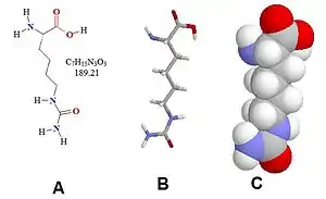 Homocitrulline is one methylene group longer than citrulline, but similar in structure. The metabolite is generated from a lysine residue after lysine reacts with cyanate. Cyanate is present in the human body in equilibrium with urea. Under physiological conditions the urea concentration may be too low to allow extensive carbamylation. However, the conversion process leading to the formation of homocitrulline from lysine in proteins is known to occur in vivo. During renal failure conditions, the urea concentration increases and carbamylation of many proteins can occur, which can be detected. It is believed that most carbamylation takes place during inflammation when the enzyme myeloperoxidase is released from neutrophils. This enzyme converts thiocyanate to cyanate. Increased levels of cyanate can now carbamylate lysine residues.
