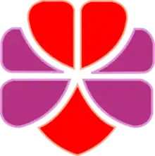 The association's symbol is a stylized trefoil. The notched edges and the mauve colour recall the symbol flower of Hong Kong, the Bauhinia blakeana, while the colour red is seen as particularly auspicious. The internal division of the trefoil shows the Chinese character Kwong meaning a ray of light from a beacon, reflecting the spirit of the Guide movement.[1]