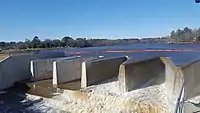 In late May 2003, over Memorial Day weekend, heavy rains caused the embankment dam to give way and also destroyed 30 feet (9.1 m) of the nearby Lakeview Road.[4] About 40 homes and 1600 people downstream were evacuated as water from Hope Mills Lake rushed down the creek causing $2.1 million in damages before making its way to the Cape Fear River. One of the floodgates on the dam had failed to open because of the pressure exerted by the flood waters, which helped push water over the top of the dam.[5] Later in 2003, Lakeview Road was repaired and plans for the repair of the dam were underway. After four years of fund and permit requests, construction on the new 14 million dollar Hope Mills Dam began in March 2007.[6] Crowder Construction Company was awarded the contract to construct the dam along with designs from Mactec, Morrison Engineers. The new dam would essentially be a concrete labyrinth-spillway that would expand the dam's ability to discharge flood waters. The new dam would be 600 feet (180 m) longer and would incorporate a fish ladder as well.[7][8] Construction of the new Hope Mills Dam was complete in June 2008 and the lake was again full by August.[8][9]
