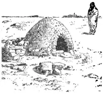 Horno (/ˈɔːrn/ OR-noh; Spanish: [ˈoɾno]) is a mud adobe-built outdoor oven used by the Native Americans and the early settlers of North America.[1] Originally introduced to the Iberian Peninsula by the Moors, it was quickly adopted and carried to all Spanish-occupied lands.[2] The horno has a beehive shape and uses wood as the heat source.[3] The procedure, still used in parts of New Mexico and Arizona, is to build a fire inside the horno and, when the proper amount of time has passed, remove the embers and ashes and insert the bread to be cooked. In the case of corn, the embers are doused with water and the corn is then inserted into the horno to be steam-cooked. When cooking meats, the oven is fired to a "white hot" temperature (approximately 650 °F or 343 °C), the coals are moved to the back of the oven, and the meats are placed inside. The smoke hole and door are sealed with mud. A twenty-one-pound turkey takes 212 to 3 hours to be cooked.[3]