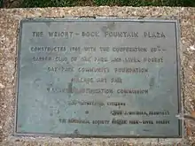 The Wright-Bock Fountain was originally built by the Oak Park Horse Show Association in 1909 and located on the curb of Lake Street, 100 feet (30.48 m) from its present location. The fountain was built to serve not only people but horses and dogs as well.[2] The fountain's design is generally believed to be a product of sculptor Richard Bock but the actual attribution is a bit fuzzy.[3] Donald P. Hallmark, a Bock historian, stated the fountain was designed by Bock between 1907 and 1908 but with the help of famous architect Frank Lloyd Wright.[3] Bock did much of Wright's architectural sculpture and worked, for a time, in Wright's studio in Oak Park as well.[4] It was Bock himself who suggested that it was Wright who pushed for the central opening in the fountain, and thus he "began to lay claim to the whole project."[3] The Frank Lloyd Wright Foundation claims the work as a Wright design from 1903.[5] The Frank Lloyd Wright Trust lists Wright as the architect and Bock as the sculptor.[6]