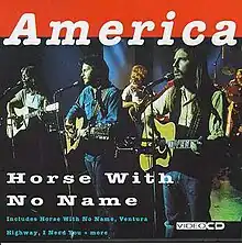 Horse With No Name is the fourth live album by American folk rock band America, released by MasterTone Records in Germany in 1995. The concert was recorded (without a live audience) for the German television program Musikladen in early 1975. This release was the first officially released live concert recording of America as a trio with Dan Peek. It included a standard audio CD along with a video CD of the same concert. This concert has also been aired on VH1 and on two separate DVD releases. Clips from the concert have also been shown on numerous television shows and commercials.