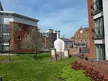 Not much survives of the old Horseley Fields. The Queen's Building, the High Level Railway Station's original carriage entrance marking the original approach now incorporated into the new transport interchange still exists, as do the Chubb Buildings and Prince Albert public house. There are a few surviving buildings on Union Mill Street, Albion Street and Walsall Street, as well as factory units around Ward Street and St James Street. Wulfruna Coal is still trading on Minerva Wharf / Lower Horseley Fields. The site of St James' Square is no longer recognisable, now the site of the Novotel hotel. Jennings Funeral Directors sits on the corner of Horseley Fields and St James Street, and have existed in the area since 1848.[5] Apartments, built c.2000 line either side of Albion Street. The Chicago Rock Cafe or CRC nightclub is situated in the area, as is Wolverhampton's new bus station on Pipers Row, which opened in 2011. It is on the western edge of the Horseley Fields area, and includes a WH Smith store, Sainsbury's Local and National Express travel shop, as well as a newly opened footbridge providing a fast link to Wolverhampton railway station.
