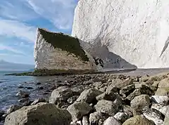 The seabed is rocky and the beach comprises a steep bank of flint pebbles. The cliffs are sheer, concave and are made of chalk, which is unstable and persons on the beach are at risk of being injured by falling rocks dislodged by the many seabirds that use the cliff as a breeding ground.[3] Horseshoe Bay lies north-north-east and adjacent to, two caves known as The Nostrils. These can be reached by scrambling over a small rocky outcrop and are partly submerged at high tide.