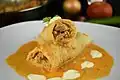 Hortobágyi palacsinta is a savoury Hungarian crêpe dish, filled with meat (usually veal or beef). The meat is prepared as a stew with onions, and seasoned with hot paprika, garlic, salt and pepper, using veal, beef, chicken or Hungarian sausage. The sauce is drained from the stew and set aside. The crêpes are then filled with the stew, tucking in the ends. The sauce is then poured generously over the crepes, topped with and tejföl (sour cream) and fresh parsley.[1][2] A popular serving option in Hungary to roll up the filled crêpes, or fold them into half and then rolling them up on the shorter side. The rolled up crêpes then can be stacked on each other with the sauce poured over them.[3]