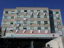 A project of Martín José Marcide, it was built on the landplot delimited by the streets of Doctor Esquerdo, Doctor Castelo, Ibiza and Máiquez formerly occupied by the Hospital de San Juan de Dios.[2] It was an enterprise of the provincial diputación; the Provincial Hospital of Madrid/General Hospital of Madrid (an institution with more than four centuries of history)[3] moved to the new facilities.[2] It was inaugurated by Francisco Franco on 18 July 1968 under the name Ciudad Sanitaria Provincial Francisco Franco.[2] Years after the death of the dictator it was renamed, making a reference to Gregorio Marañón, renowned physician. The hospital complex comprises more than 20 buildings.[3]