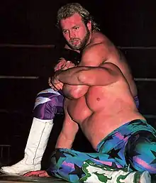 Later, he began making a name for himself as Eddie Gilbert for the CWA in Memphis, Tennessee.[3][1] He teamed with his father and Ricky Morton over the following years.[1] In addition, he formed a team with Tommy Rich as "Fargo's Fabulous Ones", an attempt by CWA (Memphis) to bury and still cash in on the fame attained by the previous incarnation of the Fabulous Ones, Steve Keirn and Stan Lane, who walked out of the territory after a dispute.[1][3] They held the AWA Southern Tag Team titles in 1984 until dropping them to Phil Hickerson and the Spoiler (Frank Morrell).[1] The duo would break up soon after, with Gilbert turning heel in the process.[3] The two had a brief but intense feud, which memorably began on television when the two were presented with a "Tag Team of the Year" award by announcer Lance Russell and two guests. Gilbert, unaware his former partner was at the taping, badmouthed Rich, then the International Heavyweight Champion, until Rich came out to confront him. Rich immediately got the upper hand, running Gibert into the steel ringpost several times, bloodying him in the process before the cameras went to a commercial. After the commercial break, Gilbert told Russell he wanted Rich to come back out so he could apologize to him in person, stating he was wrong for still being bitter about the break-up of the team, and was fueled by jealousy of Rich's championship title reign and newfound star status. When Rich accepted Gilbert's apology, Gilbert suddenly turned on him and, in front of a stunned audience and a speechless Russell, rammed Rich's head into the ringpost, just as Rich had done to him moments earlier.[5]