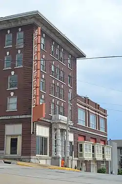 The Hotel Stratford is a historic hotel located at 229 Market St. in Alton, Illinois. The hotel, originally known as the Illini Hotel, opened in 1909. St. Louis architectural firm Barnett, Haynes & Barnett designed the hotel in the Classical Revival style. The five-story brick building features brick quoins, limestone bands and window sills, terra cotta ornamentation, and a cantilevered cornice. The hotel opened a rooftop garden in 1910 and a reception room in 1912, and it became one of many hotels which drew conventions to Alton; a contemporary newspaper account described the building as part of the "greatest improvement in property in the city of Alton". In 1925, new owner E. J. Lockyer renamed the hotel to its current name. The hotel is the only hotel built in Alton before 1950 that is still in operation.[2]