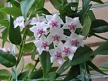 Hoya bella, the beautiful hoya, waxflower or pretty waxflower, is a species of tropical epiphyte with trailing stems, slightly succulent leaves and pendant umbels of fragrant, white and purple flowers. It is an asclepiad in the periwinkle and milkweed family, Apocynaceae.