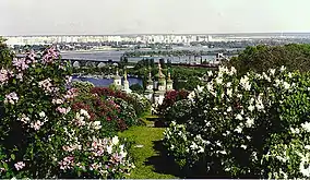 The M. M. Hryshko National Botanical Garden is a botanical garden of the National Academy of Sciences of Ukraine. It is named after the Soviet botanist Mykola Hryshko who was born in Poltava. Founded in 1936, the garden covers 1.3 km² (120 hectares) and contains 13,000 types of trees, shrubs, flowers and other plants from all over the world. It has many coniferous trees and honey locusts, and flowers such as peonies, roses, magnolias, and bushes including lilacs. The garden has hothouses, conservatories, greenhouses and rosaries. It is the most popular amongst the residents, where one can see exotic plants, and attend flower exhibitions. The blooming lilacs at the end of spring are popular in the central garden.
