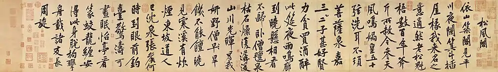 Huang Tingjian is noted for his prodigious talent in terms of his vast knowledge of Classical Chinese poetry and literature.[23] He is famous both for the calligraphy and the poetry of his work "Wind in the Pines Hall", which survives in the Palace Museum, Taipei.[24]