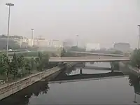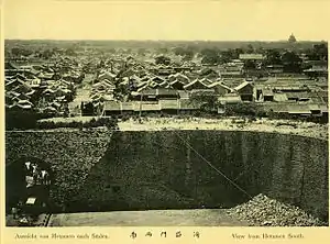 In the Yuan dynasty, the vicinity of what is now Huashi was a scenic area of lush meadows and gardens just outside the city of Dadu.[3] In 1422, an imperial lumber shop called the Sacred Wood Factory opened to process logs shipped from Sichuan to build palaces of the Ming dynasty.[3] In 1553, when the neighborhood was enclosed by the outer city wall, there were already 322 shops in the area.[3]
