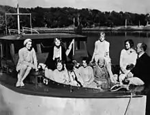 Maiden voyage of the Fairform Flyer. Frank Huckins, founder of Huckins Yacht Corporation, is seated on the right with a pipe.
