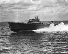 Huckins Yacht Corporation built PT boats for two squadrons during World War II. In 1940, three governing bodies – the Bureau of Ships, the Board of Inspection and Survey, and the Navy Personnel Command – had agreed that all PT boats developed up to that time were defective. Confident he had a solution, Frank Pembroke Huckins utilized his company's own "Quadraconic" Hull to build a boat that met the Navy’s PT boat guidelines. The Quadraconic design, supported by 15 years of in-house research and experimentation, was developed using a conic method worked out by Lindsay Lord,[17][18] and resulted in slightly concave bottom sections and a sharp bow entry.[19] The Huckins PT 69 was compared to those being constructed by Elco, Higgins and the Philadelphia Navy Yard in a series of comparative performance tests conducted by the Board of Inspection and Survey[20] off New London, Connecticut in July 1941, known as the "Plywood Derby". The tests allowed boats of various classes from the three manufacturers to demonstrate their seakeeping qualities and hull strength by making a run at maximum sustained speed in the open ocean. Accelerometers were installed in the pilot house of each design to record "pounding" of the hull against the water in like sea conditions. The seaway course of the open-water trial, 190 nmi (350 km; 220 mi) at full throttle, started from the mouth of New London Harbor and finished at Montauk Point Whistling Buoy.[20]
