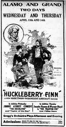 Huckleberry Finn is a surviving American silent dramatic rural film from 1920, based on Mark Twain's 1884 classic Adventures of Huckleberry Finn. It was produced by Famous Players–Lasky and distributed through Paramount Pictures. William Desmond Taylor directed Huckleberry Finn, as he had the 1917 film version of Tom Sawyer, using a scenario written by Julia Crawford Ivers, who also had been the writer for Tom Sawyer.[1]