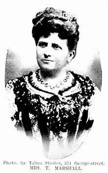 A well-known patron of the arts in Sydney, her role was recognised in 1929, along with that of her solicitor husband, Thomas Marshall, when they were made life-long members of the Royal Art Society, along with Dame Eadith Walker and Dame Nellie Melba.[15][16][17][11][12][18]