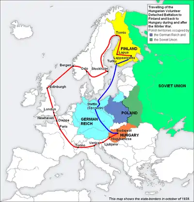 Routes taken by the Volunteer Detached Battalion to Finland (red line) and back to Hungary (blue line) during and after the Winter War.