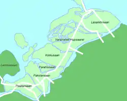 Small brooks and waterways divide the park area into smaller and larger islands. Largest of the islands are Plaatansaari, Pakolansaari, Paratiisisaari, Kiikkusaari and Lasaretinsaari. The Hupisaaret name was previously used only for the group of numerous unnamed small islands in the northern part of the park, but later the whole park area was named after these islands.[1]