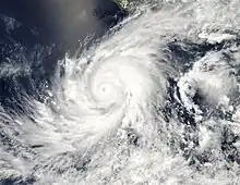 The upper-level environment became even more favorable during the overnight of June 1–2 as anticyclonic outflow developed above Blanca, providing necessary ventilation for intensification.[5] Turning south along an erratic, drifting course,[1] an eye feature developed within the storm's convective mass on June 2.[6] Blanca reached hurricane strength by 18:00 UTC and underwent rapid intensification thereafter.[1] A small, pinhole eye soon appeared on visible and infrared satellite imagery.[7] Reaching major hurricane intensity by 12:00 UTC on June 3, Blanca marked the earliest occurrence of a season's second such storm on record.[1] The system featured a small, well-defined eye surrounded by intense convection.[8] Hours later, at 18:00 UTC, the hurricane achieved its estimated peak strength as a Category 4 on the Saffir–Simpson hurricane wind scale with maximum sustained winds of 145 mph (230 km/h) and a barometric pressure of 936 mbar (hPa; 27.64 inHg).[1] Given continued favorable conditions, forecasters at the NHC predicted Blanca to achieve Category 5 status—the highest ranking on the scale, indicating winds in excess of 156 mph (251 km/h).[9]
