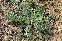 The species is a winter-blooming annual herb. It has a great number of grey-green leaves, which are connected to the stem by a 1–3 cm long petiole. The leaf blade is roughly lance-shaped, measuring 4–11 cm long and less than 2.5 cm wide. Two or three leaflets branch out from a blade which are linear or bristle-like and 1–3 mm long. There are up to 20 flowering stalks from the central rosette which eventually bear many flowers. The first flower usually grows 5–15 cm from the base of the stalk. The bracts are paired, and gradually get smaller the further up the flowering stalk they are. The sepals are around 2 mm long and oval shaped, remaining on the plant once they develop. The petals are yellow but can sometimes have dark spots or streaks. There are around 30–40 blackish seeds that are rectangular in shape and around 1 mm long.[1]