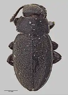 The adult beetle is 1.1 - 1.2 mm long and has a black body with pale coloured setae that give the insect a grey appearance. The larvae of this beetle are 2 mm long and are coloured pale to dark brown. Both the adult beetle and its larva are very similar in appearance to the species Hyphalus insularis.[1]