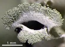 The apothecia of Hypogymnia are lecanorine in form with a constricted base and are often raised or shaped like an urn. The apothecial discs are red-brown and typically concave. Ascospores are colourless, ellipsoid, and number eight per ascus.[12] They are relatively small, less than 9 μm long.[15] Pycnidia are black and appear as small dots on the surface of the lobes.[12] The photobiont partner is trebouxioid–a green alga from the genus Trebouxia.[16]