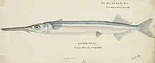 The garfish is an unusual looking fish with many distinct features such as its elongated slender body, as well as its long lower jaw. The garfish typically grows to about 22 centimeters.[2] The colouring of the fish allows it to appear somewhat camouflaged due to it having a greenish blue upper body with brown flecks and a silver-white belly and underbody.[3][4] According to Montgomery and Saunders, "the fish can control its coloration by expanding or reducing the pigment in the dorsal melanophores".[5] They also have a long silver strip running from the top of the pectoral fin base to the tail.[3]