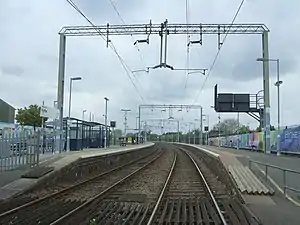 There are still sidings present at Hythe but they are no longer in use, and there was once a short branch to Hythe quay which crossed the River Colne adjacent to the station by a small iron bridge. There is no evidence today of the former quayside tracks, but aerial photograph sites clearly show the exact alignments.[4]