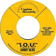 I.O.U. is a song written by Jimmy Dean and Larry Markes, and recorded most famously by Dean. A recitation with an instrumental backing that paid homage to mothers and motherhood, "I.O.U." became Dean's first top 10 country hit in 10 years and briefly sparked the comeback of sentimental-style recitations.