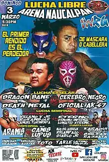 The main event of the March 2019 Máscara vs. Cabellera event Drágon Bane and Death Metal put their masks on the line while Cerebro Negro and Oficial AK-47 put their hair on the line. Because Drágon Bane pined Oficial AK-47, AK-47 was forced to have all his hair shaved off as a result of the loss, The show included six additional matches,