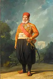 Ibrahim Pasha (Egyptian Arabic: إبراهيم باشا Ibrāhīm Bāshā; 1789 – 10 November 1848) was an Egyptian general and politician,[1] he was the commander of the Egyptian army and the eldest son of Muhammad Ali, the Wāli and unrecognized Khedive of Egypt and Sudan. He served as a general in the Egyptian army that his father established during his reign, taking his first command of Egyptian forces when he was merely a teenager. In the final year of his life, he succeeded his still-living father as ruler of Egypt and Sudan, owing to the latter's ill health. His rule also extended over the other dominions that his father had brought under Egyptian rule, namely Syria, Hejaz, Morea, Thasos, and Crete. Ibrahim pre-deceased his father, dying 10 November 1848, only four months after acceding to the throne. Upon his father's death the following year, the Egyptian throne passed to Ibrahim's nephew (son of Muhammad Ali's second oldest son), Abbas.