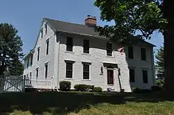 The Ichabod Bradley House stands in a rural-residential area of northeastern Southington, on the north side of Shuttle Meadow Road just west of the Plainville Reservoir. It is a 2+12-story wood-frame structure, with a side-gable roof, center chimney, and clapboarded exterior. Its main facade faces south, and is five bays wide. The ground-floor windows are topped by shallow cornices, while the second-floor windows butt against the eave. The main entrance is at the center, with flanking narrow fluted pilasters, and a half-round fanlight transom above, topped by a dentillated cap. The building corners also exhibit pilasters. A single-story addition extends the building to the rear, and the 3-acre (1.2 ha) property also includes a shed and garage, both from the 20th century.[2]