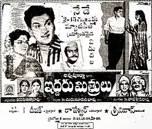 Iddaru Mitrulu (transl.Two friends) is a 1961 Indian Telugu-language drama film directed by Adurthi Subba Rao and produced by D. Madhusudhana Rao under Annapurna Pictures. The film stars Akkineni Nageswara Rao, Rajasulochana and E. V. Saroja, with music composed by S. Rajeswara Rao.[1] It is a remake of the 1957 Bengali film Tasher Ghar. The film was also made in Tamil as Ennai Pol Oruvan.[2] Urvashi Sharada made her Telugu cinema debut in her first significant adult role through this film.