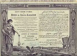 An ore wagon and rail track were depicted prominently on share certificates for the Société Anonyme Ottomane des Mines de Balia-Karaïdin printed in 1913 and issued in 1920.