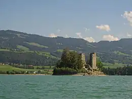 The Île d'Ogoz (French pronunciation: [il dɔɡo]; Arpitan: Ila d’Ôgo) is an island in the Lake of Gruyère, located in the canton of Fribourg. It has a length of 130 metres and a width of about 70 metres. Its highest point is 688 metres above sea level or 11 metres above lake level (677 m). The distance from the shore is 160 metres. On the island are a ruined castle and a church.