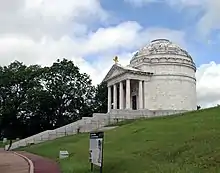 The memorial's design was based on that of the Roman Pantheon.[2][4][1] The base and stairway is made of granite quarried from Stone Mountain in Georgia, while the remainder of the 62-foot (19 m)[3][4] structure is made of Georgia marble.[4] It is the largest memorial on the battlefield.[1] According to the National Park Service, "[n]o device indicative of war" is featured in the memorial, which was specified by the commission that oversaw its creation.[1] Sixty bronze tablets line the interior of the memorial and bear the names of all 36,325 Illinois soldiers who participated in the campaign.[4][2] A bronze statue of a bald eagle, sculpted by Hibbard, sits atop the memorial.[4] It was gilded in the 1990s, along with lettering and other details on the interior.[6] The stairway consists of 47 steps, one for each day of the siege.[1][4] It is located near the Shirley House on the battlefield, along Jackson Road.[1]