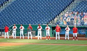 Washington Nationals players during the playing of the U.S. national anthem in a spectatorless Nationals Park