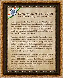 The declaration of 3 July 2021 as Indian Christian Day / Yeshu Bhakti Divas as an annual day of remembrance, is for Indian followers of Jesus to celebrate the person and message of Christ which was brought to India in 52 AD by his disciple, St. Thomas the Apostle.