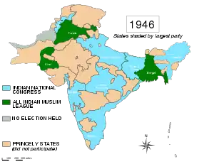 Provincial elections were held in British India in January 1946 to elect members of the legislative councils of the Indian provinces.[1] The consummation of British rule in India were the 1945/1946 elections. As minor political parties were eliminated, the political scene became restricted to the Indian National Congress and the Muslim League who were more antagonised than ever. The Congress, in a repeat of the 1937 elections, won 90 percent of the general non-Muslim seats while the Muslim League won the majority of Muslim seats (87%) in the provinces. Nevertheless, the All India Muslim League verified its claim to be the sole representative of Muslim India.[2][3] The election laid the path to Pakistan.[4][3][5]
