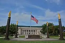 The cubical structure is clad in unrelieved ashlar Indiana limestone on a high, lightly rusticated base, and is topped with a low pyramidal roof that sheathes its interior dome. It stands on a raised terrace approached by a wide monumental staircase. The structure has four identical faces. On each face, an Ionic screen of six columns, behind which are tall banks of windows, and is surmounted by symbolic standing figures designed by Henry Hering: Courage, Memory, Peace, Victory, Liberty, and Patriotism. The sculptures are repeated on each façade. On the south side, standing on a pink granite base in the center of the grand access stairs, is Hering's colossal exultant male nude bronze Pro Patria (1929); it is 24 feet (7.3 m) high, weighs seven tons, and was the largest cast bronze sculpture in the United States.[29]