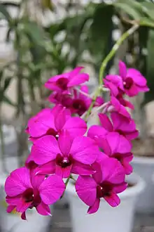 Indonesia is the source of the floral symbol of the Eternal President of the Democratic People's Republic of Korea, Kim Il Sung, exemplifying the close relations of both countries' founding fathers. President Sukarno named a cultivar of orchid Kimilsungia during Kim Il Sung's state visit in 1965. The violet Kimilsungia orchid has since become a symbol of the late Juche leader, being used in official floral arrangements representing the North Korean state.[3]