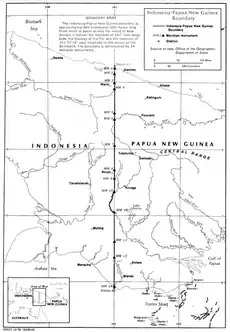 The Indonesia–Papua New Guinea border is the international border between Indonesia and Papua New Guinea. The border, which divides the island of New Guinea in half, consists of two straight north–south lines connected by a short section running along the Fly river, totalling 824 km (512 mi).[1] The boundary separates Papua, Highland Papua, and South Papua provinces of Indonesia from Sandaun and Western provinces of Papua New Guinea.
