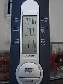 The primary purpose of the indoor-outdoor thermometer is to allow the outside temperature to be indicated inside a building, thus removing the need to go outside to take a temperature reading. They are also used in vehicles, and are particularly useful for municipal vehicles involved in snow and ice clearance.[5] Building maintenance engineers can use an indoor-outdoor thermometer that has not been installed to get a quick reading of air temperature in a location inside a building. This is done by swinging the bulb of the outdoor sensor in the air while still attached to the instrument.[6] This will get a faster reading because the bulb will come up to temperature much more quickly than the indoor sensor built into the instrument.