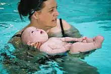 Infant swimming is the phenomenon of human babies and toddlers reflexively moving themselves through water and changing their rate of respiration and heart rate in response to being submerged. The slowing of heart rate and breathing is called the bradycardic response.[1] It is not true that babies are born with the ability to swim, though they have primitive reflexes that make it look like they are. Newborns are not old enough to hold their breath intentionally or strong enough to keep their head above water, and cannot swim unassisted.