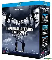 Infernal Affairs is a series of three crime-action films directed by Andrew Lau and Alan Mak, starring Andy Lau and Tony Leung. It tells the story of a police officer who infiltrates the triads, and a police officer secretly working for the same gang. The Chinese title means "the non-stop way", a reference to Avici, the lowest level of hell in Buddhism. The English title is a word play combining the law enforcement term "internal affairs" with the adjective 'infernal'. The Criterion Collection released the trilogy as a box set on November 15, 2022.